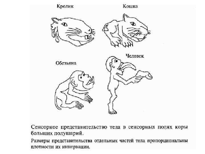 Схема чувствительного и двигательного гомункулусов (по У. Пенфильду, Т. Расмуссену). Разрез полушарий во фронтальной плоскости: а — проекция общей чувствительности в коре постцентральной извилины; б — проекция двигательной системы в коре предцентральной извилины
