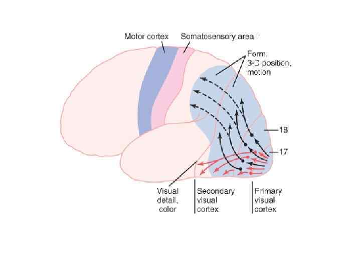 Корковый отдел зрительного анализатора v Проекционными зонами зрительного анализатора являются поля 17, 18 и 19 по Бродману (или поля VI, V 2, V 3 по современной терминологии). v Сетчатка отдельно представлена в каждом из этих полей. Наиболее упорядоченное ретинотопическое (от лат. retina сетчатка) соответствие имеет место между сетчаткой и первичной проекционной зоной — полем 17. v Первичная проекционная зона зрительной системы осуществляет первичный, более сложный, анализ информации. Там располагаются сложные нейроны с рецептивными полями детекторного типа, которые позволяют выделять из целого изображения лишь отдельные признаки и избирательно реагировать именно на эти фрагменты. Разные свойства зрительных объектов (форма, цвет, движение и т. д. ) обрабатываются в разных частях зрительной системы. v Основная масса клеток всех трех корковых полей зрительной системы специализирована на выделении ориентированных линий и контуров, составляющих основные элементы зрительных стимулов. v Рецептивные поля коры имеют не концентрическую форму, в них параллельно расположены антагонистические зоны, определенным образом ориентированные в поле зрения.