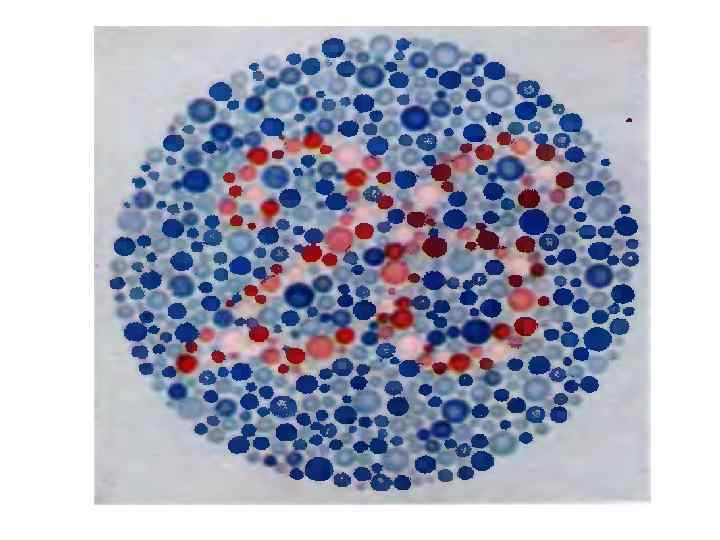 Виды нарушений цветового зрения: v Протанопия (дальтонизм) — не воспринимается красный цвет. Протанопы воспринимают красный цвет как черный, серый, коричневый, иногда зеленый. v v Дейтеранопия — не воспринимается зеленый цвет и его оттенки. Тританопия — не воспринимается синий цвет. Тританопы не различают синий и желтый цвета. v С точки зрения трехкомпонентной теории, каждый из видов цветовых аномалий соответствует отсутствию одного из трех пигментов в колбочках из за нарушенного его синтеза.