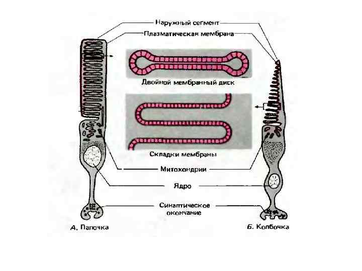 Фоторецепторы v Расположены в сетчатке, в месте наиболее удаленном от хрусталика, они повернуты от пучка падающего света. v Палочки (120 млн) отвечают за зрение в темноте и сумерках (черно белое) за счет наличия в них зрительного пигмента родопсина. v Колбочки ( 6 млн) отвечают за цветовое зрение благодаря наличию в них трех типов зрительных пигментов (йодопсин и др. ). v Зрительные пигменты (родопсин и йодопсин) состоят из ретиналя (альдегида витамина А) и гликопротеида опсина. v Они близки по строению, но отличаются по спектрам поглощения световых волн — для родопсина, палочкового пигмента, максимум находится на длине волны около 500 нм, а для иодопсина, колбочкового пигмента, — существует три пика в зависимости от типа колбочки (430— 470 нм — синий цвет, 500— 530 нм — зеленый, 620— 760 нм — красный цвет). v Недостаток витамина А в пище приводит к нарушению синтеза зрительных пигментов и к нарушению сумеречного зрения ( «куриная слепота» )
