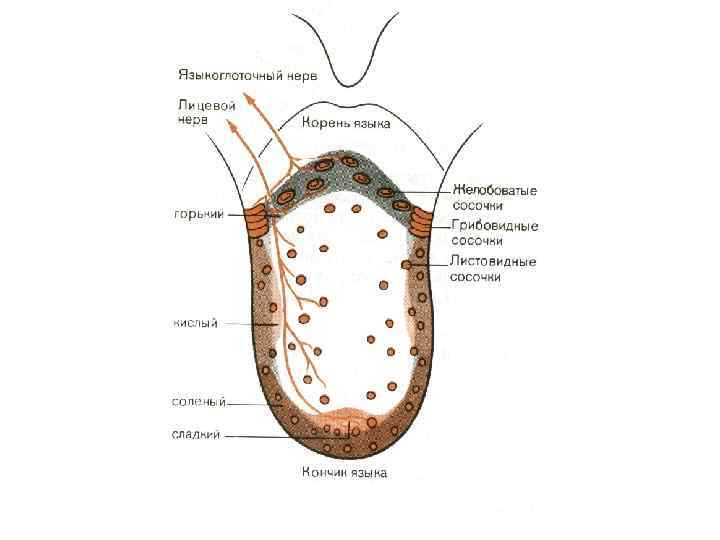 Периферический отдел Для восприятия вкуса у человека принято выделять 4 основных вкусовых ощущения (качества): v кислое (боковая поверхность ближе к корню языка) соляная, лимонная и другие кислоты; v сладкое (верхушка (кончик) языка) глюкоза, сахароза и другие углеводы; v соленое (боковая поверхность ближе к верхушке языка) поваренная соль (Na. Cl), хлорид кальция (Са. Сl 2); v горькое (корень языка) — хинин, никотин.