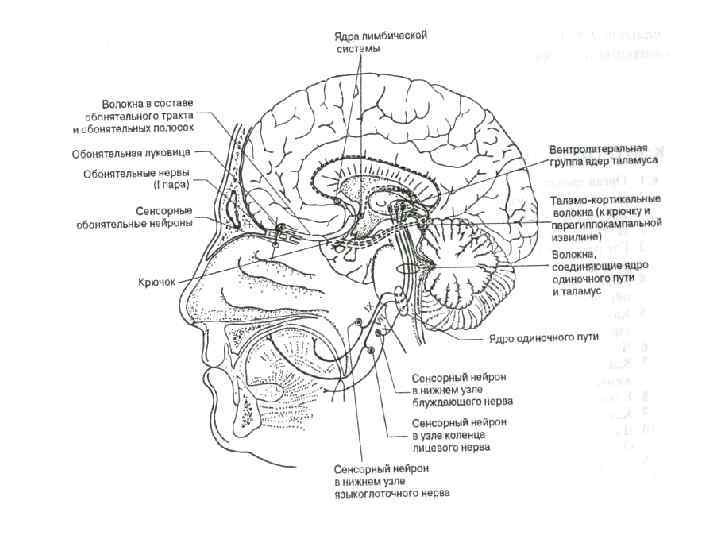 v Вкусовые волокна на каждой стороне объединяются в тракт одиночного пути (солитарный тракт), который заканчивается в ядре одиночного пути в продолговатом мозге. v Раздражение вкусовых рецепторов у человека обеспечивает реализацию ряда рефлекторных актов, связанных с пищеварением: слюноотделение, выделение желудочного сока, рвотный рефлекс. Все эти рефлексы замыкаются на уровне продолговатого мозга. v После переключения и обработки в ядре одиночного пути вкусовые сигналы в составе медиальной петли (медиального лемниска) частично перекрещиваются и достигают вентральных ядер таламуса. v И нейроны таламуса, и нейроны продолговатого мозга являются мультимодальными, т. е. реагируют на несколько разных видов сигналов.
