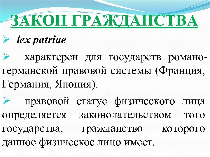 ЗАКОН ГРАЖДАНСТВА Ø lex patriae Ø характерен для государств романогерманской правовой системы (Франция, Германия, Япония). Ø правовой статус физического лица определяется законодательством того государства, гражданство которого данное физическое лицо имеет.