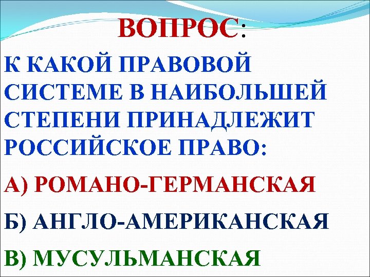 ВОПРОС: ВОПРОС К КАКОЙ ПРАВОВОЙ СИСТЕМЕ В НАИБОЛЬШЕЙ СТЕПЕНИ ПРИНАДЛЕЖИТ РОССИЙСКОЕ ПРАВО: А) РОМАНО-ГЕРМАНСКАЯ Б) АНГЛО-АМЕРИКАНСКАЯ В) МУСУЛЬМАНСКАЯ