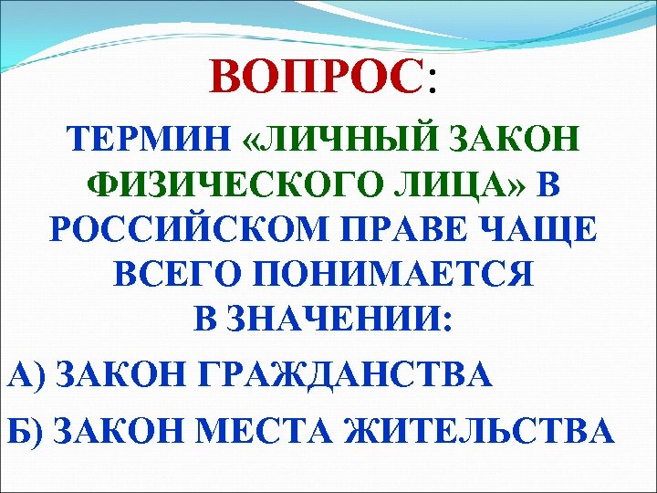 ВОПРОС: ВОПРОС ТЕРМИН «ЛИЧНЫЙ ЗАКОН ФИЗИЧЕСКОГО ЛИЦА» В РОССИЙСКОМ ПРАВЕ ЧАЩЕ ВСЕГО ПОНИМАЕТСЯ В ЗНАЧЕНИИ: А) ЗАКОН ГРАЖДАНСТВА Б) ЗАКОН МЕСТА ЖИТЕЛЬСТВА