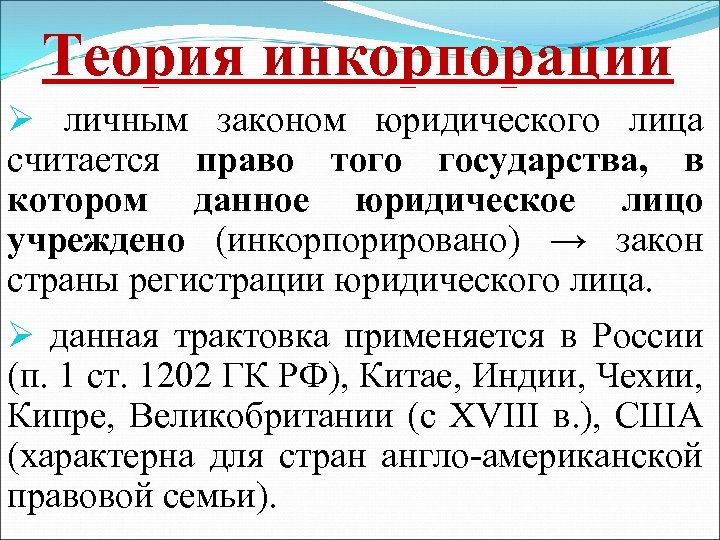 Теория инкорпорации Ø личным законом юридического лица считается право того государства, в котором данное юридическое лицо учреждено (инкорпорировано) → закон страны регистрации юридического лица. Ø данная трактовка применяется в России (п. 1 ст. 1202 ГК РФ), Китае, Индии, Чехии, Кипре, Великобритании (с XVIII в. ), США (характерна для стран англо-американской правовой семьи).