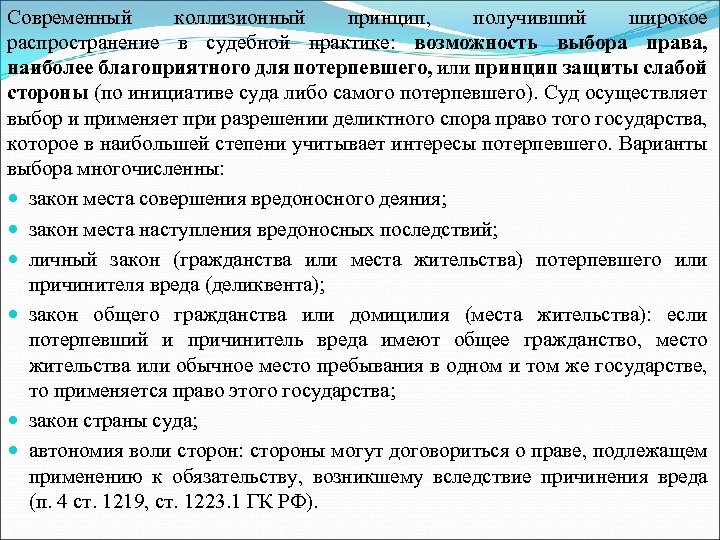 Современный коллизионный принцип, получивший широкое распространение в судебной практике: возможность выбора права, наиболее благоприятного для потерпевшего, или принцип защиты слабой стороны (по инициативе суда либо самого потерпевшего). Суд осуществляет выбор и применяет при разрешении деликтного спора право того государства, которое в наибольшей степени учитывает интересы потерпевшего. Варианты выбора многочисленны: закон места совершения вредоносного деяния; закон места наступления вредоносных последствий; личный закон (гражданства или места жительства) потерпевшего или причинителя вреда (деликвента); закон общего гражданства или домицилия (места жительства): если потерпевший и причинитель вреда имеют общее гражданство, место жительства или обычное место пребывания в одном и том же государстве, то применяется право этого государства; закон страны суда; автономия воли сторон: стороны могут договориться о праве, подлежащем применению к обязательству, возникшему вследствие причинения вреда (п. 4 ст. 1219, ст. 1223. 1 ГК РФ).