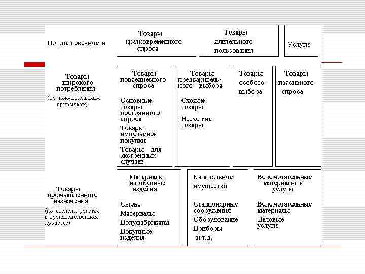 Классификация товаров промышленного назначения МАТЕРИАЛ Ы И ДЕТАЛИ КАПИТАЛЬ НОЕ ИМУЩЕСТВ О ВСПОМОГАТ ЕЛЬНЫЕ МАТЕРИАЛЫ И УСЛУГИ Сырьё Стационарн ые Сооружения Вспомогатель ные материалы Полуфабрик аты и детали Вспомогате льное оборудован ие Деловые услуги