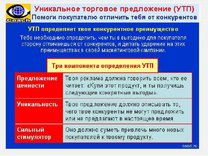 Концепция Уникального Торгового Предложения (УТП) unique selling proposition o o o Каждый производитель (продавец) мечтает сделать потребителям такое предложение, от которого они не смогут отказаться. Над приданием "обычным" товарам "уникальных" качеств трудятся многомиллионные армии технологов, дизайнеров, художников, стилистов, психологов, специалистов по рекламе и продвижению товаров. УТП формируется в голове потребителя ~ это ключевой принцип данной концепции.
