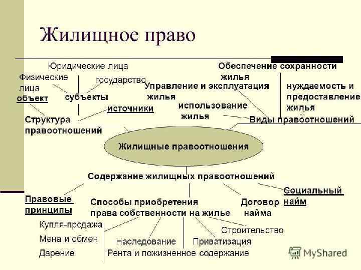 Предмет жилищного законодательства (жилищного права), входят отношения, складывающиеся по поводу управления жилищным фондом, учета граждан, нуждающихся в улучшении жилищных условий; владения и ограниченного распоряжения жилыми помещениями, предоставленными гражданам - нанимателям и членам их семей для проживания; отношения по поводу эксплуатации, обеспечения сохранности и ремонта жилых домов и жилых помещений и др.