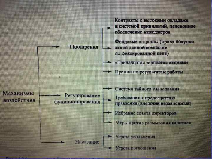 Увеличить свое благосостояние менеджер может двумя путями. Один путь — увеличение оплаты труда и социальных льгот, привилегий; другой — переход в ряды собственников. В большинстве случаев право принятия решений передается менеджерам не полностью, поэтому велико стремление менеджеров получить больше функций управления через вхождение в число собственников. Для исходных владельцев капитала это также выгодно, так как принятие решений менеджером по увеличению собственного благосостояния при оптимально составленной системе контрактов будет приводить к увеличению благосостояния внешних владельцев капитала. При акционерном построении капитала рост благосостояния достигается через увеличение дивидендных выплат (этот вариант ограничен прогрессивным подоходным налогообложением) и рыночной цены акции (при наличии развитого фондового рынка). Важно только, чтобы концентрация собственности в руках менеджера не позволяла ему игнорировать внешний контроль и интересы мелких собственников, для которых мониторинг и оказание давления становятся более дорогостоящими.
