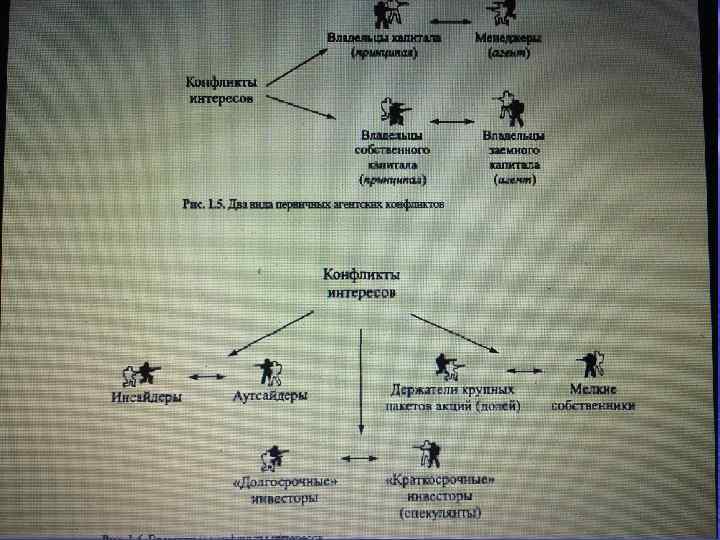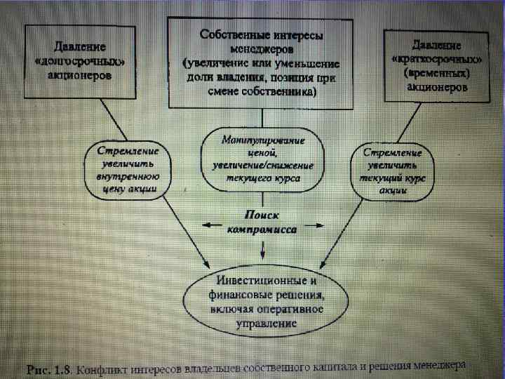 Конфликт между "долгосрочными" и "краткосрочными" инвесторами Конфликт интересов между собственниками, ориентированными на долгосрочное развитие компании, и инвесторами, желающими получить быструю отдачу на вложенные средства, накладывается на первичный агентский конфликт. Менеджер находится фактически под давлением двух групп владельцев капитала с альтернативными интересами относительно движения рыночной оценки их вклада. На выбор менеджера будут влиять и его собственные интересы. В ряде случаев менеджер будет ориентироваться на краткосрочные решения, приводящие к временным положительным изменениям, игнорируя необходимость увеличения внутренней цены компании, которая определяется долгосрочными будущими денежными потоками.