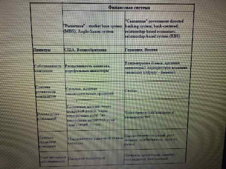 Российский рынок, как и большинство развивающихся рынков, тяготеет к "связанной" финансовой системе со всеми присущими ей чертами: слабое развитие контрактной системы, правовой базы, отсутствие прозрачности деятельности, а следовательно, неполнота информации. При этом к классической "связанной" системе, представленной множеством компаний Японии и Германии, добавляются проблемы развивающихся рынков: несогласованность по срокам активов и пассивов промышленных предприятий (когда долгосрочные активы покрываются краткосрочными обязательствами), доминирование обязательств в иностранной валюте, наличие теневой экономики и криминализация отдельных сфер деятельности.