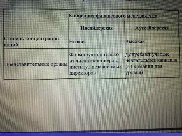 При общепризнанности выводов агентской теории системы управления хозяйствующих субъектов разнятся, и можно говорить о концепциях финансового менеджмента, отличающихся постановкой целей, выбором источников финансирования и объектов инвестирования. Так, выделяют три модели корпоративного управления стран с развитыми рынками капитала: англоамериканскую, японскую и немецкую. Однако, несмотря на различие в управлении компаниями Японии и Германии, в логике финансовых решений у них имеется много общего, что позволяет говорить о наличии двух концепций принятия инвестиционных и финансовых решений: аутсайдерской (американской) и инсайдерской ориентированной на банки). Указанные концепции финансового менеджмента базируются на двух различных финансовых системах, которые условно можно назвать "рыночной" и "связанной» .