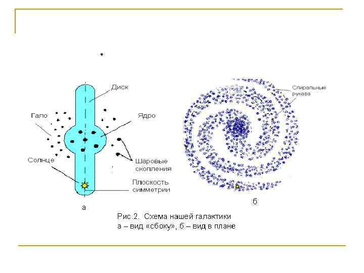 n n n Среднее расстояние между звёздами в Галактике примерно 10 световых лет, отсюда среднее число звёзд – 50 млрд. Когда мы смотрим в направлении центра Галактики, видим огромное скопление звёзд – Млечный Путь. Солнце находится на расстоянии примерно в 2/3 от центра до края Галактики в одном из её рукавов. От слабых звёзд Млечного Пути свет идёт до Земли десятки тысяч лет – так далеки они от нас. Для земного наблюдателя спиральные ветви экваториального пояса Галактики проецируются в виде светлой полосы Млечного Пути, составляющего основу Галактики (от греч. galaktikos– млечный, молочный).