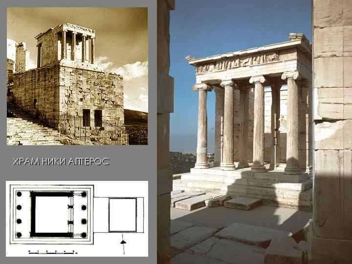 • • • Ансамбль Акрополя дає приклад співставлення внутрішнього, масштабного людині, і зовнішнього просторів. Розділяє ці простори портик кор Ерехтейона. Він є свого роду захисним бар'єром між внутрішнім І зовнішнім просторами. Об'ємна форма портика виділяє з цілого вичленований простір для людини, звідки вона може без остраху споглядати зовнішній світ. Фігури кор, близькі за розміром і детальній проробці до людини стають посередниками між нею і тим безмежжям, звідки вони вийшли своїми міфологічними витоками. Інша ситуація ставить людину сам на сам з прірвою. Великий світ розкрився перед заглибленою у тінь північною стіною Ерехрейона. У глядача, майже притиснутого до цієї стіни і невідокремленого від розкритого безмежжя, народжується метафора напруженого протистояння людини і світу. Темрява і світло - символи двох світів-опозицій охопили беззахисну людину, не даючи їй надії на визволення