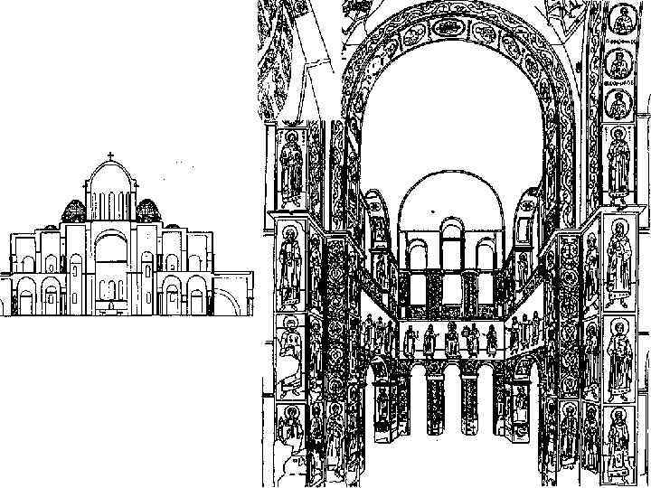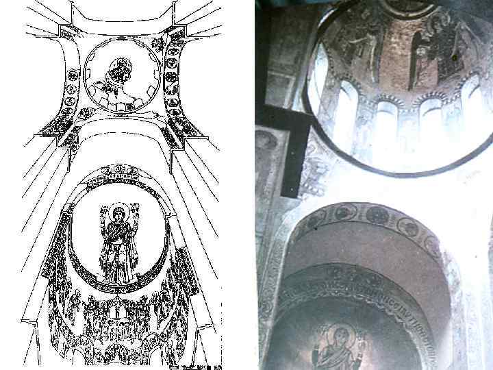 Масштаб опозицій в композиції Софійського собору в Києві • У масштабі Софійського собору можна виділити такі головні градації: масштаб головного підкупольного простору сакральний "божественний" масштаб "макрокосму"; йому підпорядкований масштаб головної мозаїки - Оранти з конхи алтарної апсиди й Пантократора з куполу; масштаб бокових нав є перехідним; - масштаб людини відбито у розмірах фресок на стовпах.