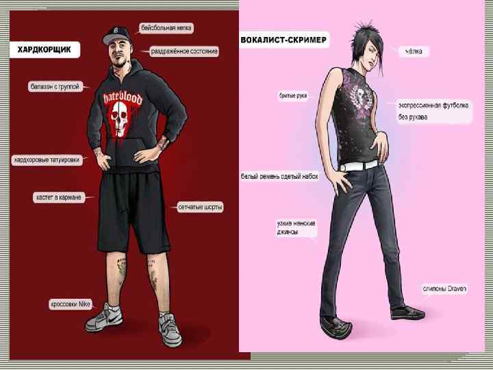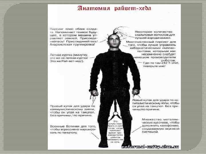 Скінхеди Актівність пріхільніків екстремістської Молодіжної субкультури скінхедів ( скінів , неонацістів ) в России помітно зросла. Мабуть , це найагресівніші з неформалів. Ідеї у них Типового націстські : « Росія - російськім ! » , «Смерть євреям ( Неграму , китайці , кавказці. . . )! » . Ідеальнім політічнім діячем для них є А. Гітлер. Скіні , як правило ( альо НЕ завжди) , віділяються начисто поголеною головою. Одягаються скінхеди в подібність ВІЙСЬКОВОЇ форми або просто у вузькі Темні джинси. На ногах - важкі черевики - « хакі » , Якими скінхеди уміло діють в Бійці. Коханою музика - це стиль ой ( відгалуження хардкору , что політізується ) , а такоже Німецькі Військові марші. Вороги скінхедів - ВСІ , хто НЕ скінхеди. Смороду часто нападають на людей з іншім Кольорах шкірі , на бомжів , представніків нетрадиційної сексуальної орієнтації. Особлива ненависть - до реперам и всім довговолосім. Основну масу скінхедів складають молоді люди від 14 до 22 років , Переважно віхідці з робочих кварталів и околиць , школярі , что вчаться технікумів , студенти вузів. Багато скінхеди , особливо молоді , фанати якого- небудь футбольного клубу.