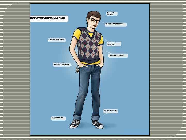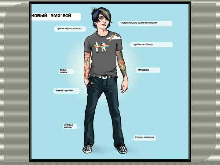 Емо молодіжна субкультура, яка утворилась на базі прибічників однойменного музичного жанру. Найпоширеніша субкультура серед підлітків 13 -17 років (хоча іноді трапляються й старші прихильники). Головне для представників цієї субкультури - емоції. І вони черпають їх звідусіль - ізмузики, книг, кіно. Часто в емо-музиці переважає крик ( «скрім» ), плач, вереск. Серед інших субкультур особливою любов'ю не користуються, особливо хлопчача частина емо. Їх вважають плаксіями і всерйоз практично не сприймають. Носять виключно чорно-рожевийодяг, кеди, часто стрижуть волосся і залишають довгу чілку, що закриває пів-обличчя. Волосся і нігті нерідко фарбують у чорний колір. Хлопці вдягають обтягуючі штанці з низеньким поясом і приталені майки з назвами рок-гуртів, ремені із заклепками, . Люблять обвішуватися значками з героями американських мультфільмів і фенечками, пірсинг, татуювання, часто носять маленькі тонелі. Мета їхнього одягу — стерти різницю між хлопцем і дівчиною. справжній «емо» не палить і не вживає алкоголь і наркотики, не бере участь у безладних статевих зв’язках, не зраджує свої ідеали, про усе це свідчать татуювання у вигляді хреста на руках деяких «емо» . [1] Прихильники емо дуже чутливі, емоційні діти, які виносять протест «сірому, буденному» суспільству. Але, найголовніше, цей протест може бути небезпечним для самих представників цієїсубкультури, оскільки носить саморуйнівний характер.