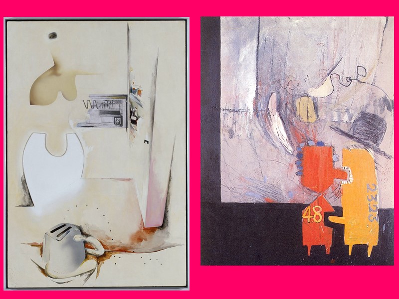 **David Hockney. Adhesiveness. 1960. Oil on board, 50 x 40” Modern Art Museum of Fort Worth http://arthistory.knoji.com/a-bigger-splash-the-art-of-david-hockney/ Hockney used an alphabetic code to identify the abstracted figures as himself (4.8. = D.H.) and Whitman (23.23. = W.W.).