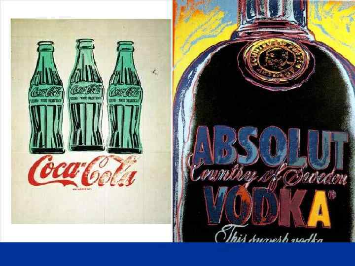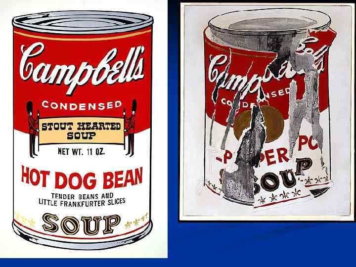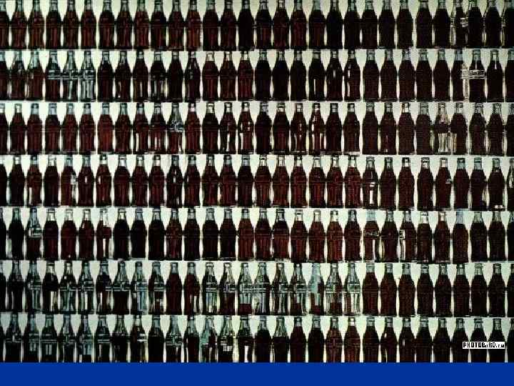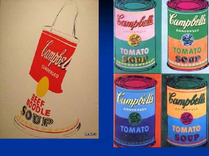 Поп-арт направление в изобразительном искусстве 1950 -1960 -х годов, возникшее как реакция на абстрактный экспрессионизм, использующие образы продуктов потребления. n Образ, заимствованный в массовой культуре, помещается в иной контекст: - изменяются масштаб и материал; - обнажается приём или технический метод; - выявляются информационные помехи n Представители поп-арта провозгласили своей целью «возвращение к реальности» , но реальности, уже опосредованной масс-медиа: источником их вдохновения стали глянцевые журналы, реклама, упаковка, телевидение, фотография. Поп-арт вернул предмет в искусство, но это был предмет, не опоэтизированный художественным видением, а предмет нарочито бытовой, связанный с современной индустриальной культурой и, в особенности, с современными формами информации (печать, телевидение, кинематограф). n Новые технические приемы, позаимствованные из промышленного дизайна и рекламы: фотопечать, использование диапроектора, включение реальных предметов, способствовали как «обезличиванию» индивидуальной творческой манеры художника, так и «раскрытию эстетической ценности» образцов массовой продукции. n