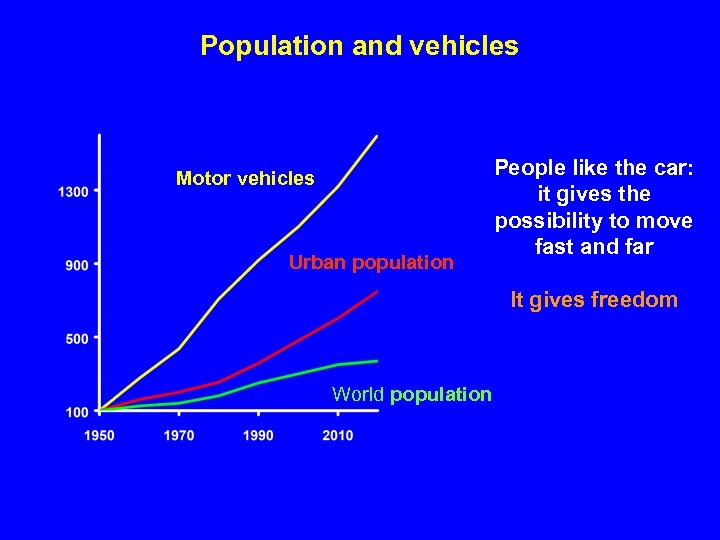 Population and vehicles Motor vehicles Urban population People like the car: it gives the possibility to move fast and far It gives freedom World population