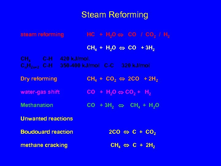 Steam Reforming steam reforming HC + H 2 O CO / CO 2 / H 2 CH 4 + H 2 O CO + 3 H 2 CH 4 C-H Cn. H 2 n+2 C-H 420 k. J/mol. 350 -400 k. J/mol C-C 320 k. J/mol Dry reforming CH 4 + CO 2 2 CO + 2 H 2 water-gas shift CO + H 2 O CO 2 + H 2 Methanation CO + 3 H 2 CH 4 + H 2 O Unwanted reactions Boudouard reaction 2 CO C + CO 2 methane cracking CH 4 C + 2 H 2