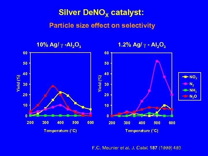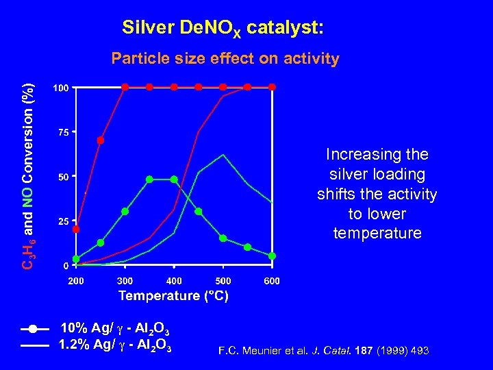 Silver De. NOX catalyst: C 3 H 6 and NO Conversion (%) Particle size effect on activity Increasing the silver loading shifts the activity to lower temperature 10% Ag/ - Al 2 O 3 1. 2% Ag/ - Al 2 O 3 F. C. Meunier et al. J. Catal. 187 (1999) 493.