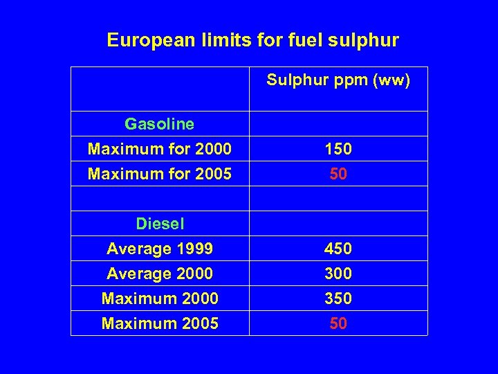 European limits for fuel sulphur Sulphur ppm (ww) Gasoline Maximum for 2000 150 Maximum for 2005 50 Diesel Average 1999 Average 2000 Maximum 2005 450 300 350 50