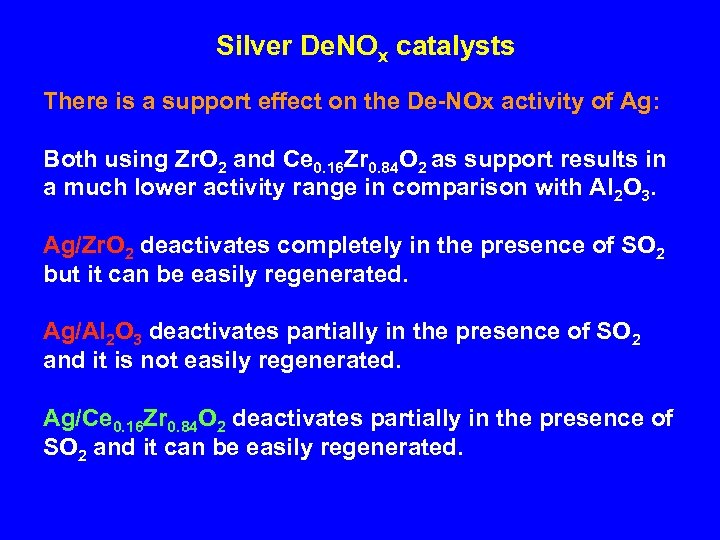 Silver De. NOx catalysts There is a support effect on the De-NOx activity of Ag: Both using Zr. O 2 and Ce 0. 16 Zr 0. 84 O 2 as support results in a much lower activity range in comparison with Al 2 O 3. Ag/Zr. O 2 deactivates completely in the presence of SO 2 but it can be easily regenerated. Ag/Al 2 O 3 deactivates partially in the presence of SO 2 and it is not easily regenerated. Ag/Ce 0. 16 Zr 0. 84 O 2 deactivates partially in the presence of SO 2 and it can be easily regenerated.