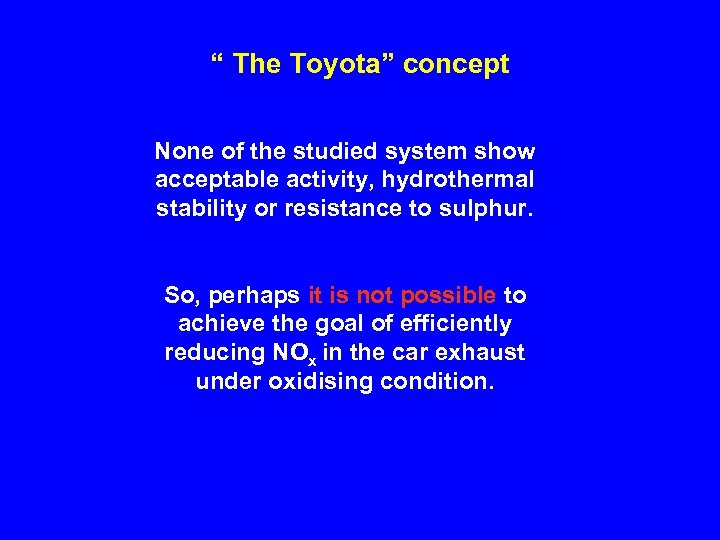 “ The Toyota” concept None of the studied system show acceptable activity, hydrothermal stability or resistance to sulphur. So, perhaps it is not possible to achieve the goal of efficiently reducing NOx in the car exhaust under oxidising condition.