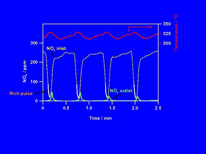 325 300 NOx / ppm NOx inlet 200 100 NOx outlet Rich pulse 0 0 0. 5 1. 0 1. 5 Time / min 2. 0 2. 5 Temperature / °C 350