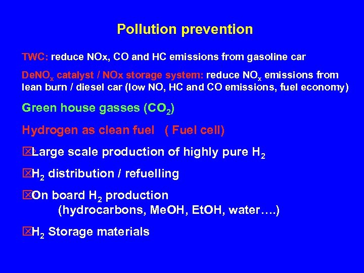 Pollution prevention TWC: reduce NOx, CO and HC emissions from gasoline car De. NOx catalyst / NOx storage system: reduce NOx emissions from lean burn / diesel car (low NO, HC and CO emissions, fuel economy) Green house gasses (CO 2) Hydrogen as clean fuel ( Fuel cell) Ö Large scale production of highly pure H 2 Ö 2 distribution / refuelling H Ö board H 2 production On (hydrocarbons, Me. OH, Et. OH, water…. ) Ö 2 Storage materials H