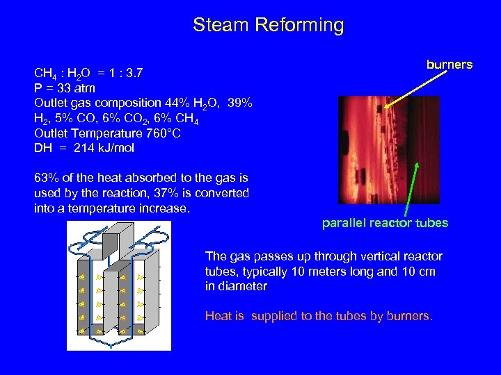 Steam Reforming CH 4 : H 2 O = 1 : 3. 7 P = 33 atm Outlet gas composition 44% H 2 O, 39% H 2, 5% CO, 6% CO 2, 6% CH 4 Outlet Temperature 760°C DH = 214 k. J/mol burners 63% of the heat absorbed to the gas is used by the reaction, 37% is converted into a temperature increase. parallel reactor tubes The gas passes up through vertical reactor tubes, typically 10 meters long and 10 cm in diameter. Heat is supplied to the tubes by burners.