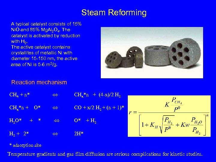 Steam Reforming A typical catalyst consists of 15% Ni. O and 85% Mg. Al 2 O 4. The catalyst is activated by reduction with H 2. The active catalyst contains crystallites of metallic Ni with diameter 15 -150 nm, the active area of Ni is 5 -6 m 2/g. Reaction mechanism CHx*n + (4 -x)/2 H 2 O* CO + x/2 H 2 + (n + 1)* * O* 2 H* CH 4 + n* CHx*n + H 2 O* + H 2 + 2* + H 2 * adsorption site Temperature gradients and gas film diffusion are serious complications for kinetic studies.