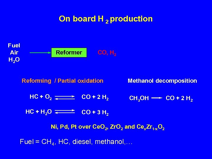 On board H 2 production Fuel Air H 2 O Reformer CO, H 2 Reforming / Partial oxidation HC + O 2 CO + 2 HC + H 2 O Methanol decomposition CO + 3 H 2 CH 3 OH Ni, Pd, Pt over Ce. O 2, Zr. O 2 and Cex. Zr 1 -x. O 2 Fuel = CH 4, HC, diesel, methanol, … CO + 2 H 2