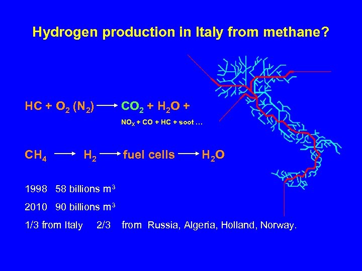 Hydrogen production in Italy from methane? HC + O 2 (N 2) CO 2 + H 2 O + NOX + CO + HC + soot … CH 4 H 2 fuel cells H 2 O 1998 58 billions m 3 2010 90 billions m 3 1/3 from Italy 2/3 from Russia, Algeria, Holland, Norway.