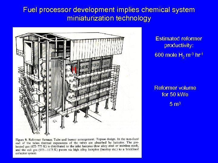 Fuel processor development implies chemical system miniaturization technology Estimated reformer productivity: 600 mole H 2 m-3 hr-1 Reformer volume for 50 k. We 5 m 3