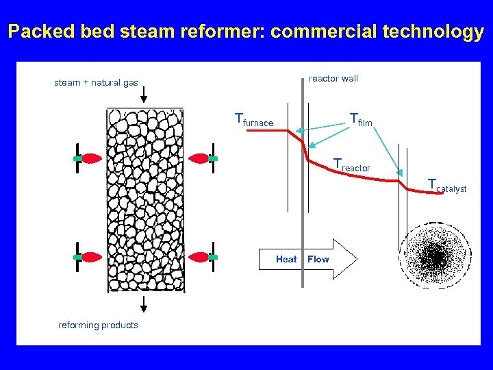 Packed bed steam reformer: commercial technology reactor wall steam + natural gas Tfurnace Tfilm Treactor Tcatalyst Heat reforming products Flow