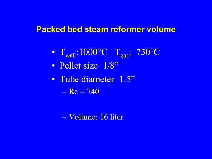 Packed bed steam reformer volume • Twall: 1000°C Tgas: 750°C • Pellet size 1/8” • Tube diameter 1. 5” – Re = 740 – Volume: 16 liter
