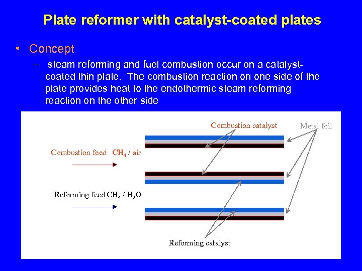 Plate reformer with catalyst-coated plates • Concept – steam reforming and fuel combustion occur on a catalystcoated thin plate. The combustion reaction on one side of the plate provides heat to the endothermic steam reforming reaction on the other side Combustion catalyst Combustion feed CH 4 / air Reforming feed CH 4 / H 2 O Reforming catalyst Metal foil