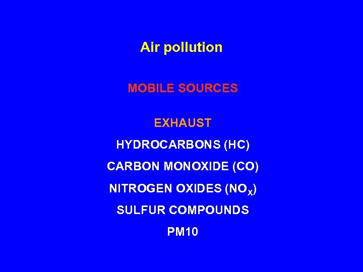 Air pollution MOBILE SOURCES EXHAUST HYDROCARBONS (HC) CARBON MONOXIDE (CO) NITROGEN OXIDES (NOX) SULFUR COMPOUNDS PM 10