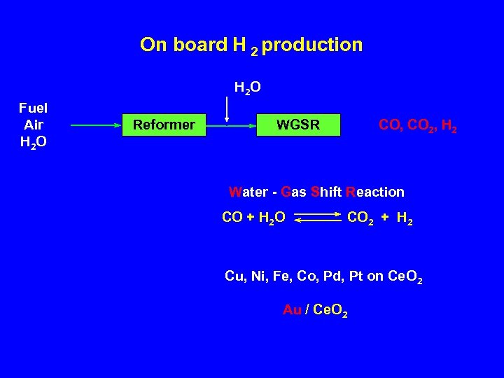On board H 2 production H 2 O Fuel Air H 2 O Reformer WGSR CO, CO 2, H 2 Water - Gas Shift Reaction CO + H 2 O CO 2 + H 2 Cu, Ni, Fe, Co, Pd, Pt on Ce. O 2 Au / Ce. O 2