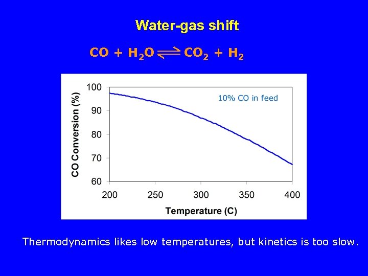 Water-gas shift CO + H 2 O CO 2 + H 2 Thermodynamics likes low temperatures, but kinetics is too slow.