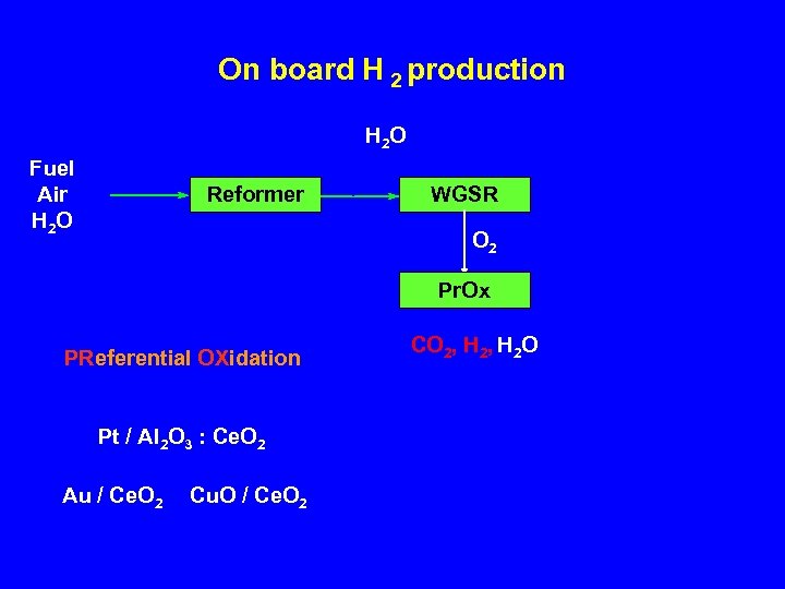 On board H 2 production H 2 O Fuel Air H 2 O Reformer WGSR O 2 Pr. Ox PReferential OXidation Pt / Al 2 O 3 : Ce. O 2 Au / Ce. O 2 Cu. O / Ce. O 2 CO 2, H 2 O