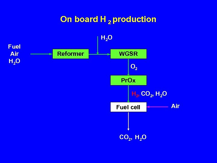 On board H 2 production H 2 O Fuel Air H 2 O Reformer WGSR O 2 Pr. Ox H 2, CO 2, H 2 O Fuel cell CO 2, H 2 O Air