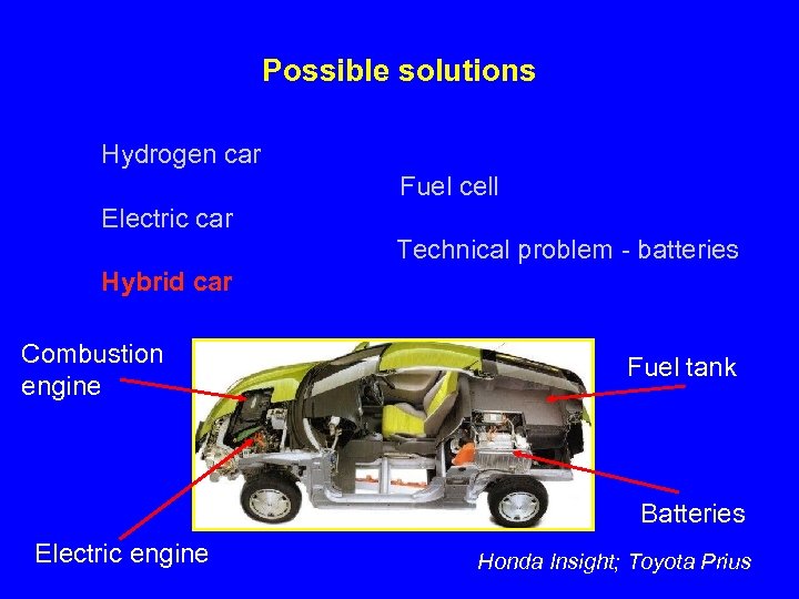 Possible solutions Hydrogen car Fuel cell Electric car Technical problem - batteries Hybrid car Combustion engine Fuel tank Batteries Electric engine Honda Insight; Toyota Prius