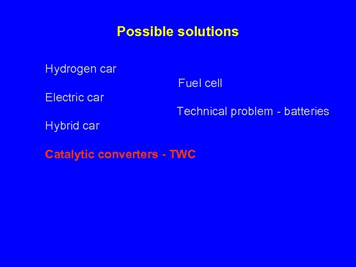 Possible solutions Hydrogen car Fuel cell Electric car Technical problem - batteries Hybrid car Catalytic converters - TWC