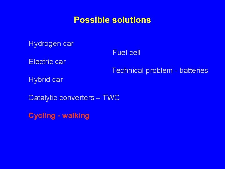 Possible solutions Hydrogen car Fuel cell Electric car Technical problem - batteries Hybrid car Catalytic converters – TWC Cycling - walking