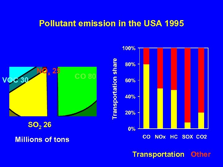 VOC 30 NOx 25 CO 80 Transportation share Pollutant emission in the USA 1995 SO 2 26 Millions of tons Transportation Other